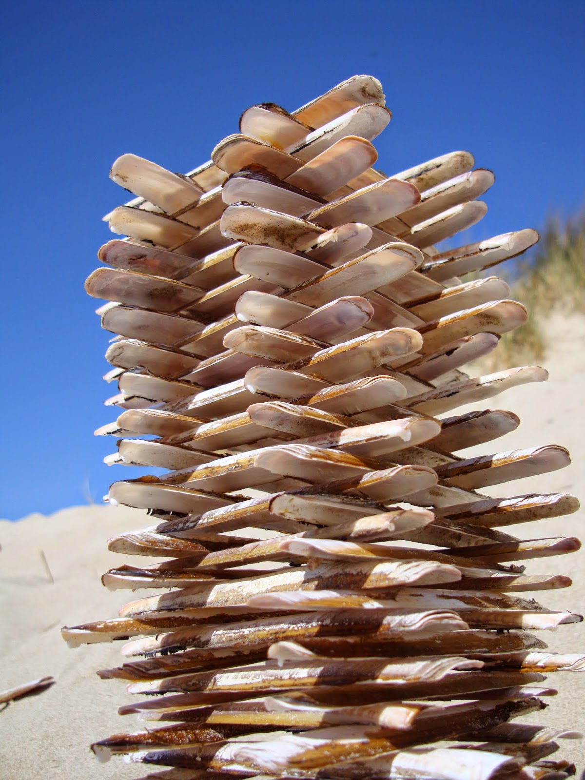 Le Touquet, Landart, art éphémère, nature, plage, coquillages, cailloux, bord de mer, mer, vacances, soleil, moules, patèle, littorine, crépidule, birgorneau, troque, lavagnon, palourde, pétoncle, turitelle, huitres, pomme de pin, Bettina Mercier, Artiste de plage, mobiles, têtes cailloux, bois flotté, Actes Sud Junior, bois flottés,